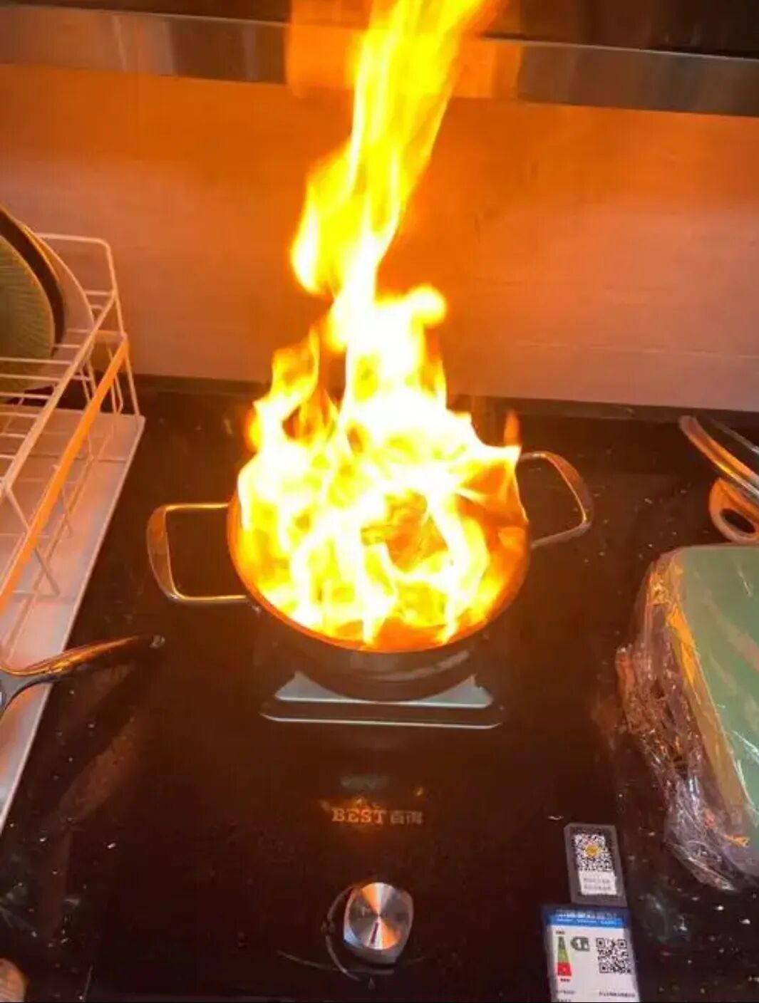正确做法:立刻关闭气源,顺手拿起锅盖平推盖上,隔绝空气;或者倒入大量切好的蔬菜,利用降温灭火。当然,若是配备了灭火毯,可用灭火毯覆盖油锅,直至火源熄灭。切记千万别用水,也别试图端锅——滚烫的油晃出来就是重度烫伤。